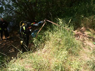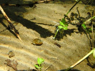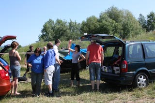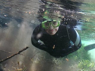 Nach einem Abschiedsfrühstück verließen die Berliner am Sonntag wehmütig das lieb gewonnene Quartier und machten sich auf den Weg zu einer letzten Schnorchel-Erlebnisstour. Vorsichtig platschten die Flossen im Flachwasser, um die üppige Pflanzenwelt nicht zu zerstören. Eine halbe Stunde ging es mühsam stromaufwärts, teilweise durch weit ins Wasser ragende Äste und wirres, verzweigtes Gestüpp. Mit reichlich Grünzeug getarnt verließen die Froschmenschen dann Neptuns kaltes Reich und wärmten sich in der gleißenden Sonne wieder auf. Nach und nach trennten sich Auto für Auto von dem urig schönen Ort und traten die lange Heimfahrt an.